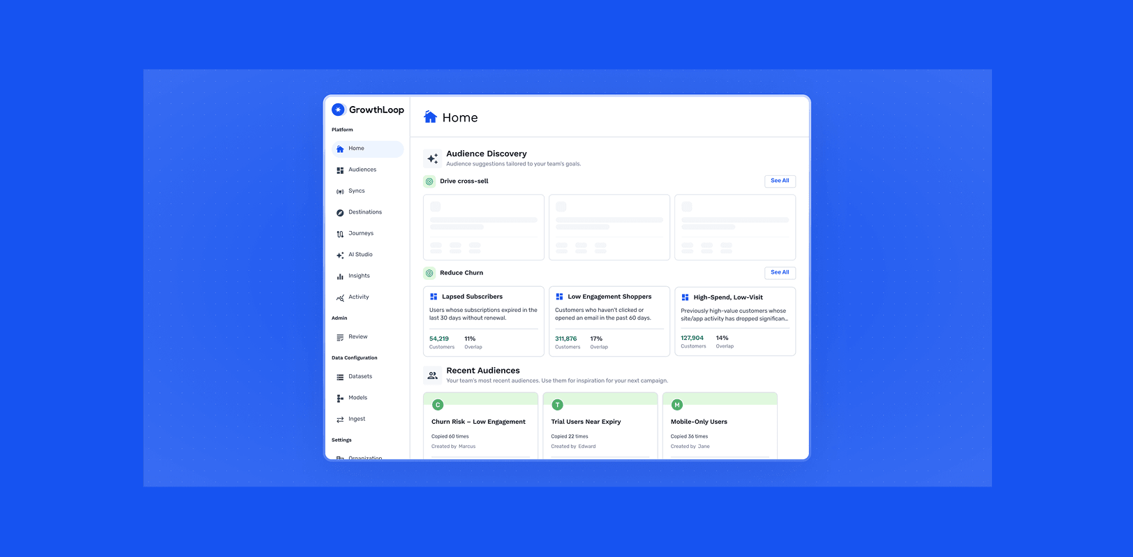 Get StartedGrowthLoop empowers marketers and business teams to self-serve audience creation on any data point, creating highly personalized and targeted campaigns like promoting portable hotspot devices to frequent travelers. Marketers are also able to access modeled data to leverage in lead scoring, upsell, cross-sell, and retention campaigns.